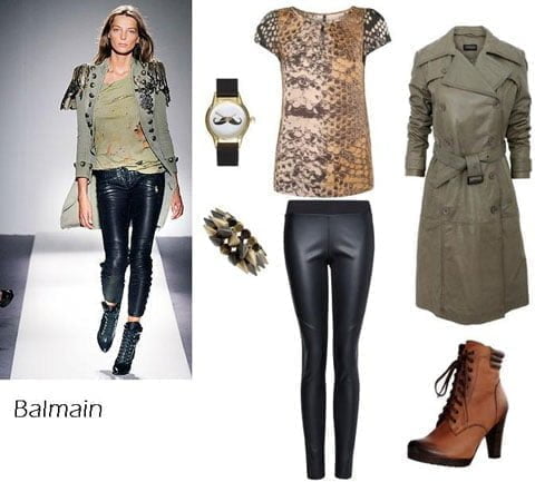 Styl militarny zawładnął nie tylko wybiegami ale również ulicami miast! Jesienią niezwykle trendy są szczególnie buty – ciężkie, sznurowane i na obcasie. Nam szczególnie spodobała się stylizacja inspirowana pokazem Balmain.
