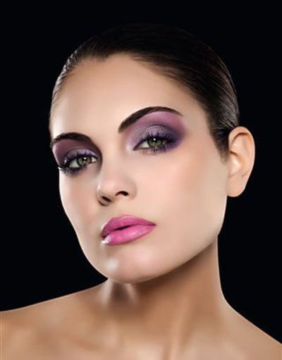 Propozycja makijażu marki Nouba to wyraziste, mocno podkreślone oczy w różnych odcieniach fioletu, usta podkreślone różową, matową pomadką i świeża cera muśnięta delikatnym różem. Idealna propozycja na wieczór!