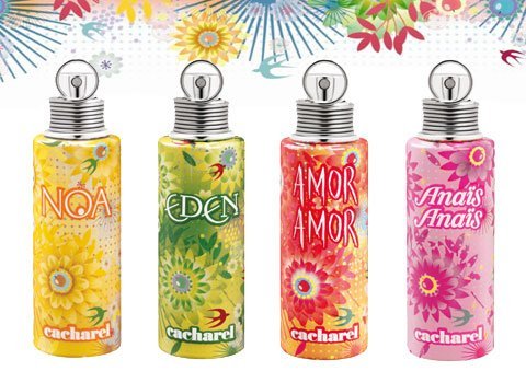 Specjalnie dla kolekcji, ilustratorka, Charlotte Gastaut, stworzyła kolorowy świat Paradis poprzez odświeżenie kwiatowego wzoru, który jest znakiem rozpoznawczym marki Cacharel.