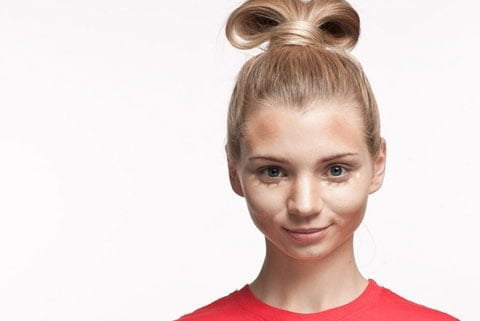 2. Poczekaj, aż krem dobrze się wchłonie, a następnie nałóż podkład Simple Beauty. My użyliśmy aż trzech rodzajów fluidów w różnych odcieniach: jasnym, pośrednim oraz ciemnym. Na boki twarzy nałóż najciemniejszy podkład, pod oczami najjaśniejszy. Ciemnymi odcieniami skoryguj kształt twarzy (czoło, nos, żuchwa). Pamiętaj o zasadzie – jasny odcień uwypukla, ciemny chowa. Korektor rozświetlający nr 1 pod oczy wklep opuszkami palców, aby stał się niewidoczny pod okiem i odpowiednio rozjaśnił oraz rozświetlił okolice oczu.