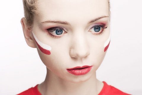 5. Przy tym makijażu rezygnujemy z różu na rzecz biało-czerwonych pasków na policzkach. Możesz wykonać je za pomocą specjalnych farb lub kredek do malowania twarzy dostępnych w sklepach z artykułami papierniczymi.