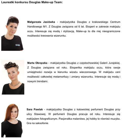 30 listopada 2012 roku Douglas wybrał dziesięciu najbardziej utalentowanych makijażystów, którzy będą pełnić rolę ambasadorów marki. Osoby te zwyciężyły w konkursie Douglas Make-up Team zorganizowanym wspólnie z marką Dior. Partnerem projektu był FujiFilm. Poznaj szczegóły!