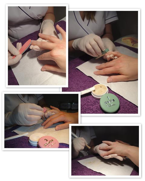 Przy użyciu specjalnego dwukolorowego pilnika płytka paznokciowa jest wygładzana i matowiona. Kolejny krok to nałożenie i wmasowanie pasty. Ma ona konsystencję wysuszonej gliny. Już przy jej nakładaniu widać, jak paznokcie nabierają połysku. Po nałożeniu pasty, wmasowywany jest puder ochronny. Jego nadmiar strzepywany jest specjalnym pędzelkiem.