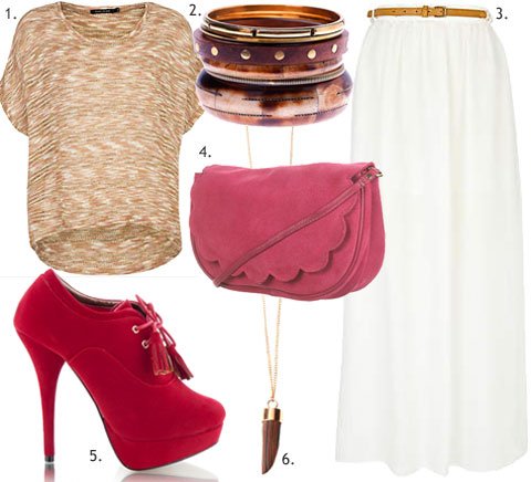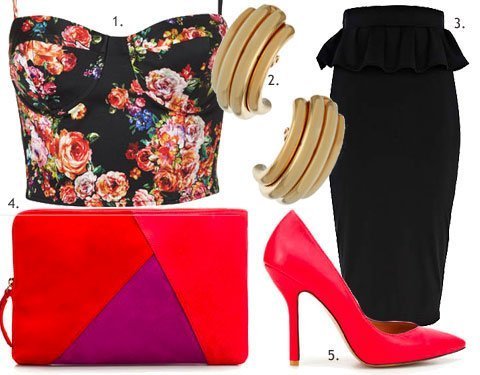 1) bluzka Top Shop 2) kolczyki Top Shop 3) spódnica River Island 4) torebka Zara 5) szpilki Zara