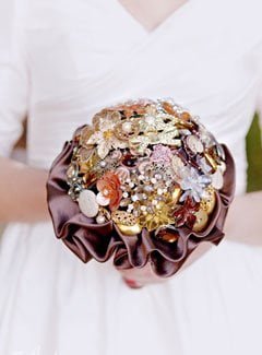 Bukiet z broszek dopasujesz do każdego stylu – nie musi być on jedynie zwariowanie kolorową kompozycją świecidełek. Do delikatnej, romantycznej stylizacji pasować będzie bukiet z tkaninowych kwiatów z tiulu, satyny, koronki i atłasu z dodatkiem biżuteryjnych elementów. Do ślubu w stylu glamour – bukiet z biżuterii „łapiącej światło” w jednolitej kolorstyce. Guzikowe bukiety to świetny pomysł na ślub z przymrużeniem oka lub utrzymany w klimacie lat 50., a odważne panny młode mogą się zdecydować na ślub w stylu techno lub steampunk, zamawiając bukiet z zębatek i mechanizmów starych zegarków. Każdy pomysł jest dobry!