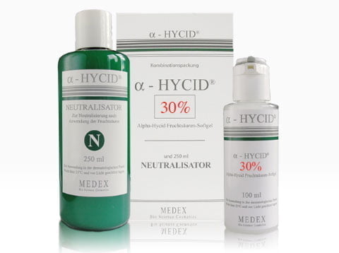 Preparaty z serii α-Hycid zawierają niezneutralizowane kwasy owocowe o najniższym na rynku pH do 0,6 oraz wysokich stężeniach 30% do 70 %. Naturalna kombinacja trzech niezneutralizowanych kwasów AHA (mlekowego, cytrynowego i winowego) zapewnia zmniejszenie przyczepności zrogowaciałego naskórka, przyspieszenie naturalnych procesów odnowy skóry oraz poprawę elastyczności i plastyczności najbardziej zewnętrznej warstwy naskórka.