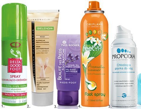 1) Good Foot spray dezodorująco-odświeżający (Delia Cosmetics, 6-8 zł/100 ml) 2) Kuracja Parafinowa krem antyperspirant do suchej, pękającej skóry stóp i pięt (Bielenda, ok. 10 zł/75 ml) 3) Beaute Des Pieds żel chłodzący do stóp (Yves Rocher, 21,90 zł/50 ml) 4) Feet Up aromatyczny dezodorant do stóp (Oriflame, 19,90 zł/150 ml) 5) chłodząca pianka do nóg (Propodia, 19,90 zł/150 ml)