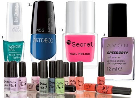 1) lakier Wonder Nail Wide Brush (IsaDora, 31 zł) 2) lakier Ceramic Nail Laquer (Artdeco, 19,50 zł) 3) lakier Nail Poli Paradise Lagoon (My Secret, 6,99 zł) 4) lakier Nail Enamel Speeddry+ (Avon) 5) lakiery no.1 (Delia Cosmetics, ok. 3 zł/5 ml)