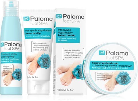 zestaw do pielęgnacji stóp Paloma footSPA: chłodząco-kojący żel do nóg i stóp (ok. 9 zł/125 ml), intensywnie wygładzający balsam do stóp (ok. 9 zł/100 ml), cukrowy peeling do stóp z olejem winogronowym i migdałowym (ok. 9 zł/125 ml)