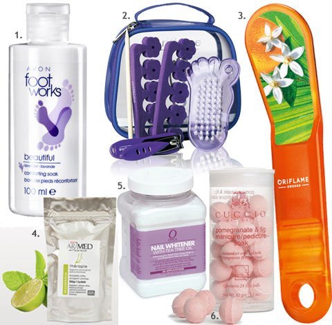 1) Foot Works kojąca kąpiel do stóp (Avon, 14 zł/100 ml) 2) Foot Care Set zestaw do stóp (Oriflame, 36,90 zł) 3) tarka do stóp Aromatic Summer (Oriflame, 11,90 zł) 4) saszetka z kompleksem Solnym do kąpieli i peelingu stóp i łydek (ArMed Regenracja, 8,40 zł/140 g) 5) Nail Whitener wybielacz do paznokci (Orly) 6) kulki musujące do manicure/pedicure Granat i Figa (Cuccio, 42 zł/24 szt.)