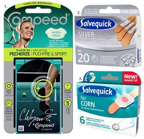 1) plastry na pęcherze na piętę Caroline Woźniacki (Compeed, 22,99 zł/5 szt.) 2) plastry Silver Technology (Salvequick, ok. 7,50 zł/mix. 20 szt.) 3) plastry na odciski (Salvequick, 5,78 zł/6 szt.)