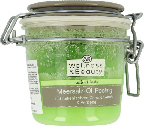 - Wellness & Beauty peeling solny z olejem z pestek cytryny i werbeną, cena: 13,99 zł/300 gr