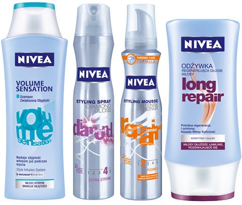 od lewej: szampon Nivea Volume Sensation, lakier Nivea Diamond Gloss, pianka Nivea Intense Repair, odżywka Nivea Long Repair