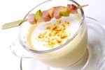 Speck zarumienić na patelni, zalać wywarem z warzyw, winem i śmietaną. Dodać ser i gotować na małym ogniu przez około 10 minut. Odcedzić i zmiksować aż do otrzymania pianki. Podawać w filiżance i posypać curry.