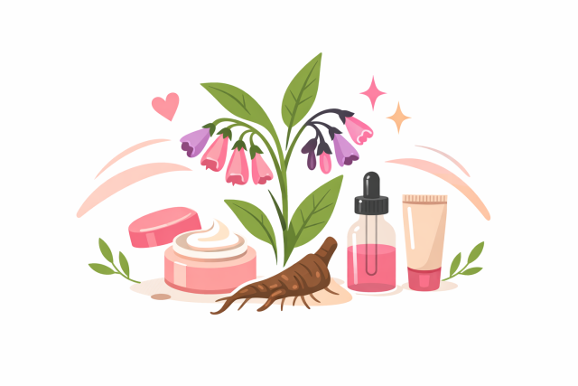 Alantoina stanowi kluczowy składnik żywokostu z punktu widzenia zastosowań kosmetycznych. Wykazuje zdolność stymulowania podziałów komórkowych, wspiera proces gojenia się uszkodzeń naskórka oraz łagodzi podrażnienia. Śluzy i garbniki działają nawilżająco oraz ochronnie, tworząc na skórze delikatny film zabezpieczający przed utratą wody i czynnikami drażniącymi. Flawonoidy oraz kwasy fenolowe wzmacniają działanie przeciwzapalne i antyoksydacyjne, dzięki czemu żywokost znajduje zastosowanie w produktach do pielęgnacji skóry wrażliwej i skłonnej do podrażnień.