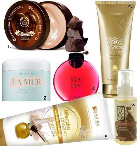 1. nawilżające masło do ciała Chcomania 48 h (The Body Shop, 65 zł) 2. długotrwale nawilżający krem do ciała The Body Creme (La Mer, 887 zł), 3. płyn do kąpieli Bath z żurawiną i liczi (Sephora, ok. 25 zł) 4. scrub cukrowy Milk & Honey (Oriflame, 26,90 zł) 5. mleczko pod prysznic z proteinami mleka i miodu Miss (Barwa, 7 zł) 6. rozgrzewający olejek pod prysznic i do kąpieli z olejkiem cynamonowym, imbirem i pomarańczą (Pat & Rub, 69 zł)