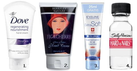 1. intensywnie odżywiający krem do rąk do bardzo suchej skóry (Dove, ok. 8,90 zł) 2. krem do rąk Fig & Cherry (BSQ 120 Range, 45 zł) 3. krem koncentrat do rąk i paznokci Extra Soft 5% Urea (Eveline Cosmetics, 5,40 zł) 4. klinika paznokcia w małej butelce Hard as Nails (Sally Hansen, 23 zł)