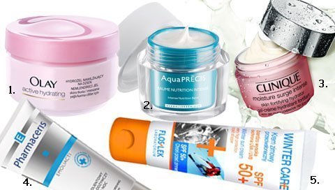1. hydrożel nawilżający na dzień do cery tłustej/mieszanej (Olay Active Hydrating, zł. ok. 16,99 zł) 2. intensywnie nawilżający krem Aqua Précis (Uriage), 3. intensywnie nawilżający krem-żel Moisture Surge Intense Skin Fortifying Hydrator (Clinique, 135 zł) 4. emolientowy krem odżywczy na noc Emoliacti (Pharmaceris E, 34,90 zł) 5. krem zimowy przeciwsłoneczny SPF 50+ Winter Care (Floslek, 14,40 zł)