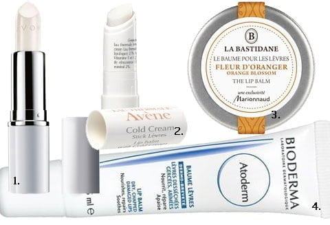 1. szminka pielęgnacyjna (Avon, 25 zł) 2. pomadka ochronna Cold Creme (Avène, 30 zł) 3. balsam do ust Kwiat Pomarańczy (La Bastidane, w perfumeriach Marionnaud) 4. balsam do ust Atoderm (Bioderma, 23 zł)